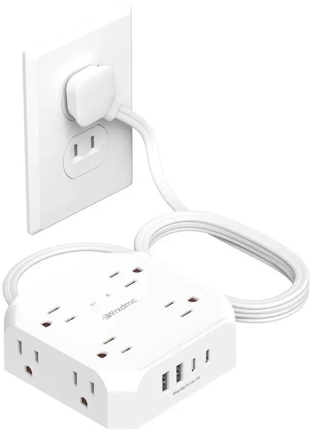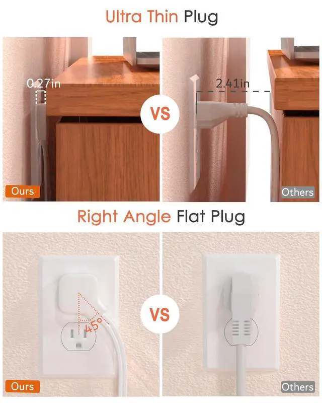 2 Prong Flat Plug Power Strip: With only a 0.27-inch flat plug design, the flat wall plug is much thinner than traditional plugs, allowing it to easily close to the wall and hide behind furniture, beds, or refrigerators, maximizing your home's space. The 45° angle flat plug design keeps another outlet free.