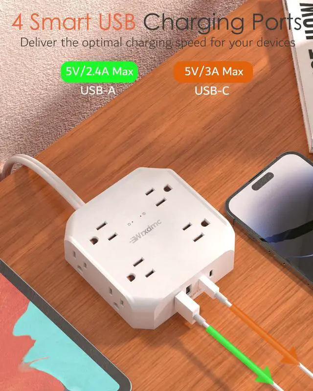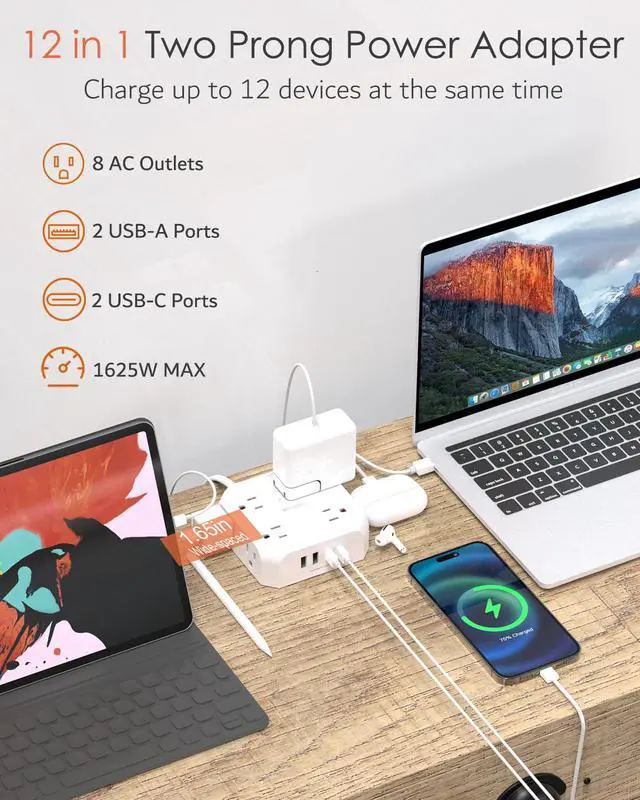 12-in-1 Design Charging Station: This two prong to three prong outlet adapter features 8 outlets + 4 USB ports, safely charging up to 12 devices from a single small wall charging unit. Maximum capacity up to 1625 Watt (Max 125 Volt, 13 A). The USB ports will automatically detect devices and deliver the optimal charging current. Maximum 2.4A output for 2 USB-A ports, maximum 3.0A output for 2 USB-C ports, 3.4A/17W total. Compatible with mobile phones, cameras, e-readers, and more.