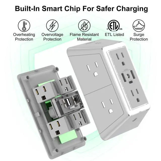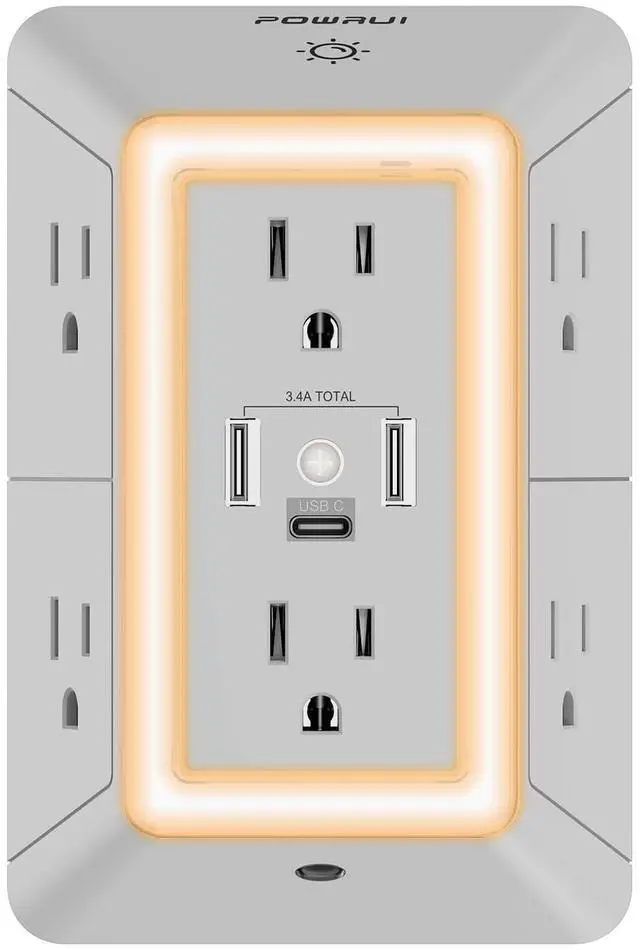 Multi-function USB Wall Outlet: 3 USB fast charging ports (1 USB C Port), 3-sided Power Strip with 6 Adapter Spaced Outlets, and LED night light around the edges. Replaces a standard socket while offering multiple plugs. Suitable for any indoor room or public area. Save space with a unique 3D design. NOTE: The USB-C port does not support devices requiring 14~22V charging voltage.