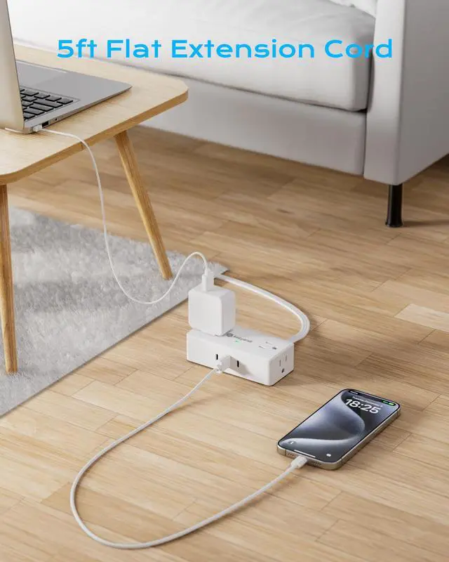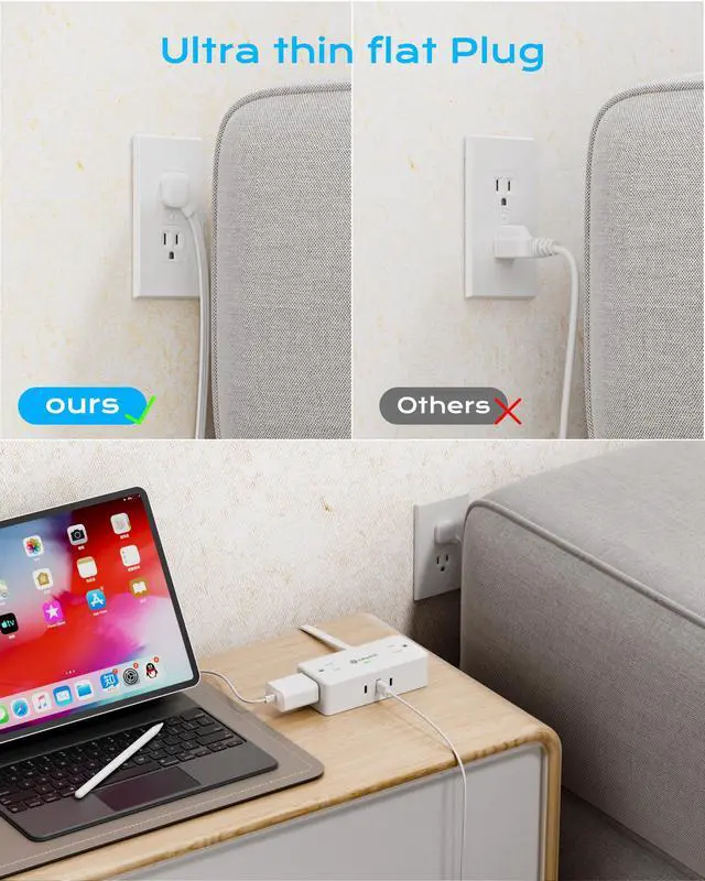 5ft flat plug extension cordThe ultra-thin flat plug, measuring only 0.31 inches, easily fits into wall outlets located behind furniture such as beds, desks with closed backs, and couches.