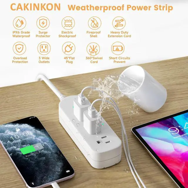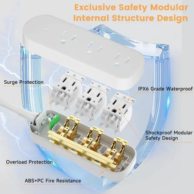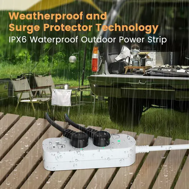 Outdoor Power Strip WeatherproofThis IPX6 waterproof power strip is equipped with 3 AC outlets with surge protection, rated at 1625W/13A, designed to work during water splashes or thunderstorms. The back is designed to reroute any liquid, making it perfect for both outdoor and home use. Made from durable and heat-resistant ABS+PC material, this power strip meets safety compliance standards.