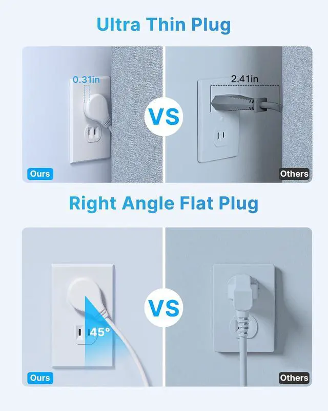 Ultra Flat Plug Power Strip: With only a 0.31-inch ultra-thin flat head, this adapter can be placed close to the wall and hidden behind sofas, beds, or other furniture. The 45° angle design makes it more flexible, creating extra space for other plugs below without obstruction.
