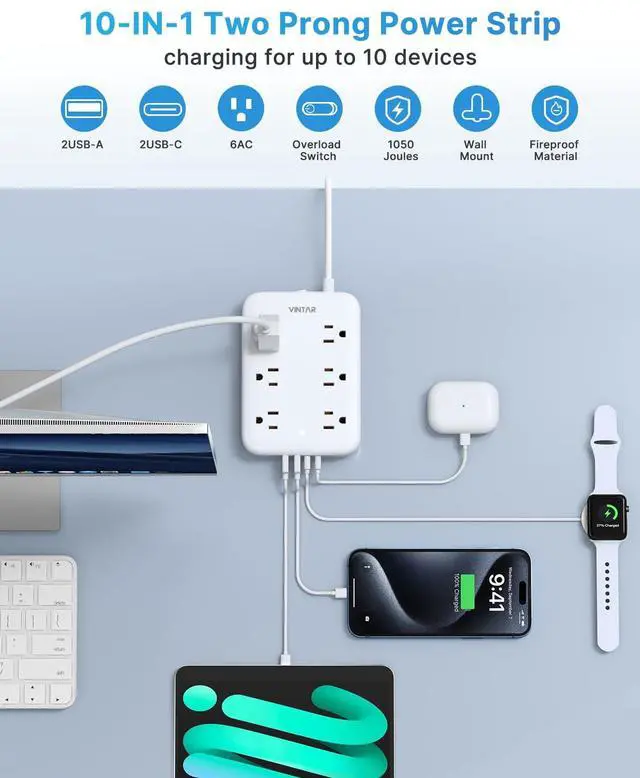 10 in 1 Design Charging Station: This two prong extension cord turns 1 socket into widely spaced (1.5 inch) 6 AC outlets (1625W Max), 2 USB-A, and 2 USB-C, allowing you to charge up to 10 devices simultaneously. Dual USB-C ports can charge up to 5V/3.4A Max, while dual USB-A ports can charge up to 5V/2.4A Max, compatible with cellphones, laptops, tablets, earphones, or cameras without needing additional chargers.
