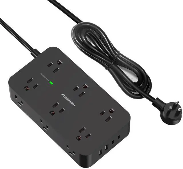 Extension Cord 15 Ft - This 15 feet black extension cord features 12 AC outlets and 4 USB ports (2 USB C) to power everything on your desk. With built-in Smart IC technology, the 4 USB ports can auto-detect and deliver the appropriate current to your devices. Two keyholes on the back allow for easy mounting on walls or furniture. The 45° angled flat plug fits perfectly in narrow spaces like behind a bookshelf or nightstand without covering the bottom receptacle of a duplex outlet.