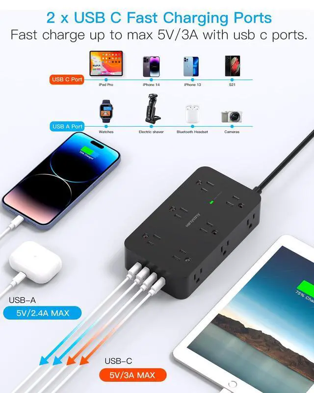 USB C Charging Station - This surge protector power strip with a 15 ft cord includes two USB-C ports (5V/3A) and two USB-A ports (5V/2.4A), providing a total USB output of 5V/3.1A. Thanks to smart charging technology, the outlet extender automatically detects your devices and optimizes charging efficiency, making it perfect for your iPhone, iPad, tablet, Bluetooth earphones, and more.