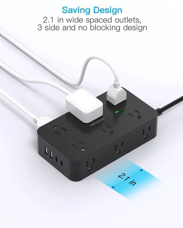 2.1 in Wide Spaced & Space-Saving - The extension cord features 2.1 inches of space between outlets, larger than standard sockets, allowing for big adapters without blocking each oth