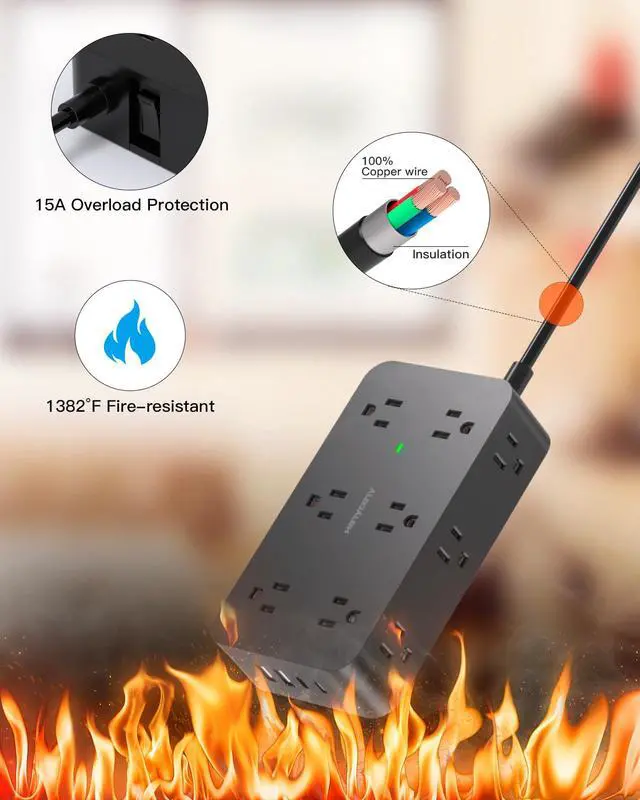 1800J Surge Protection - This extension cord with multiple outlets provides 1800J surge protection, safeguarding your electronics from lightning, surges, and spikes. The switch automatically shuts off when power exceeds the limit, protecting your devices like computers and TVs. The "Surge Protected" indicator light assures you that your devices are secure, making it an essential power strip for any dorm or home.