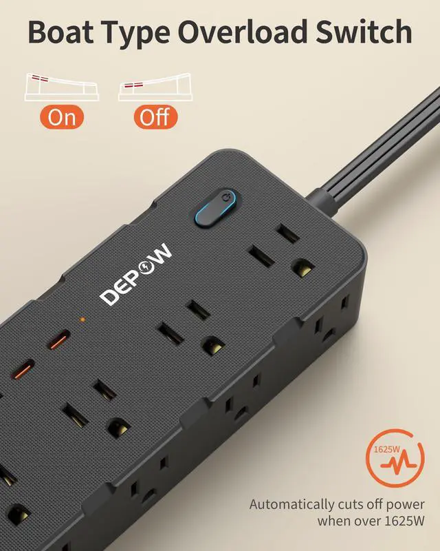 Safeguard Your Devices: With an overload protection switch, this power strip automatically cuts off power when the total power exceeds 1625W, ensuring the safety of your connected devices.