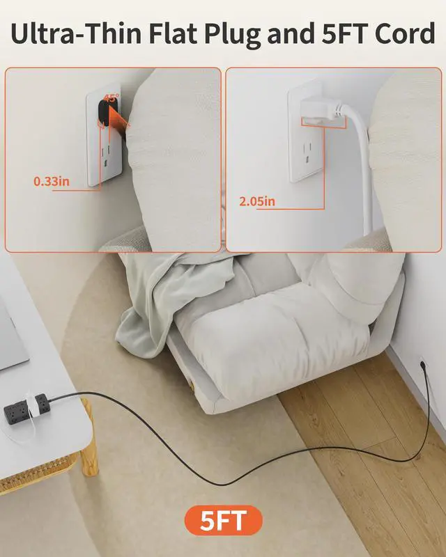 Ultra Thin Flat Plug: The 0.33in ultra-thin flat plug design allows you to easily plug in this power strip even behind furniture or in tight spaces, while the 5FT cord provides added durability and flexibility.
