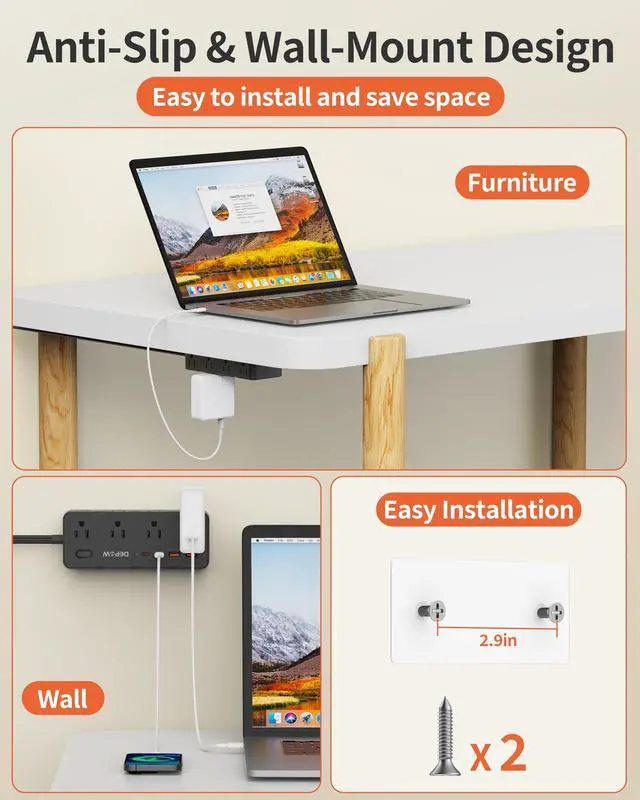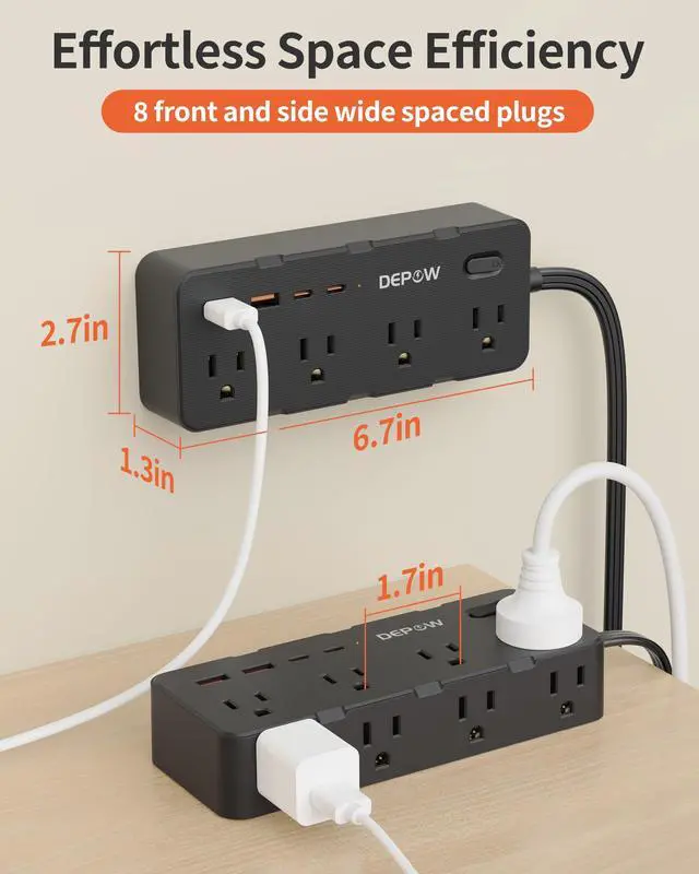 Space-saving Design: The 2-sided 1.7in space-saving design of this power strip allows you to easily accommodate bulky plugs without blocking adjacent outlets. Comes with 2 screws for easy installation, allowing you to mount it on walls or other surfaces to save space.