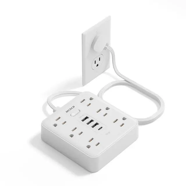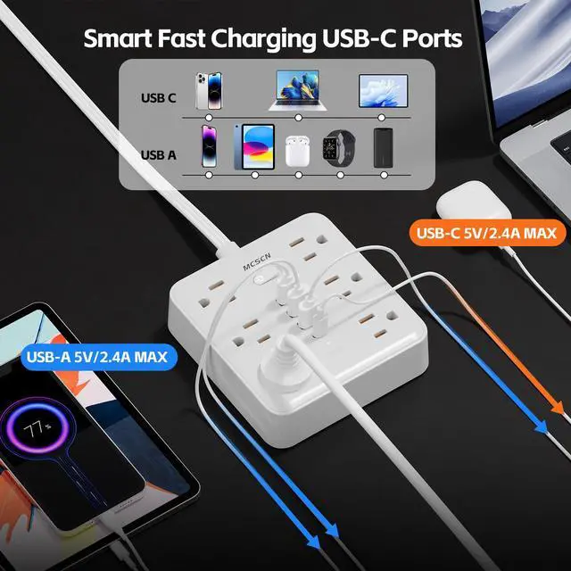 10in1 POWER Strips: This 3-pin power strip has 6 AC outlets and 4 USB ports (1 USB C charger), IC Smart Recognition charging speed faster and faster charging speed up to 2.4A (USB-C), total 5V/2.4A, also can power 10 devices; socket interval 1.3 inch, can install most plugs without clogging each other.