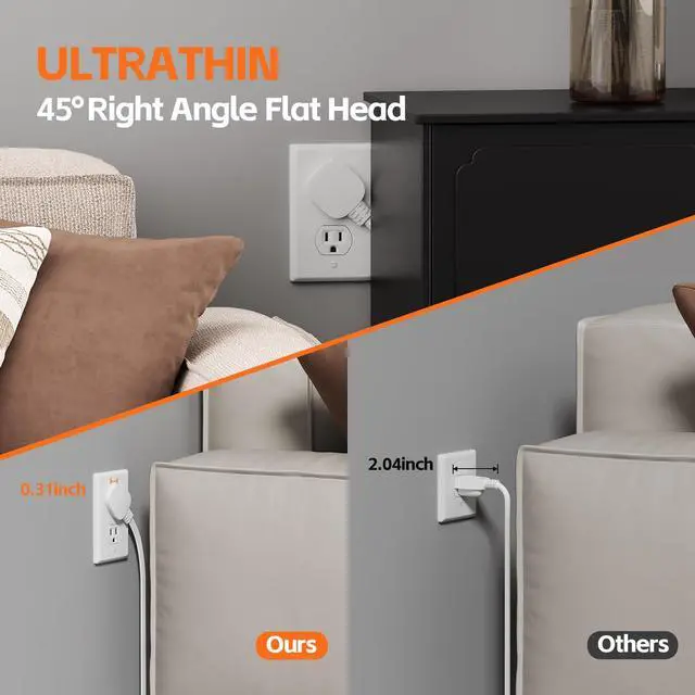 Ultra Thin Flat Plug: Ultra thin flat 45° right angle plug is thin and space-saving compared to conventional plugs, easy to install in tight spaces such as sofas, dressers, bookshelves or other furniture close to the wall.
