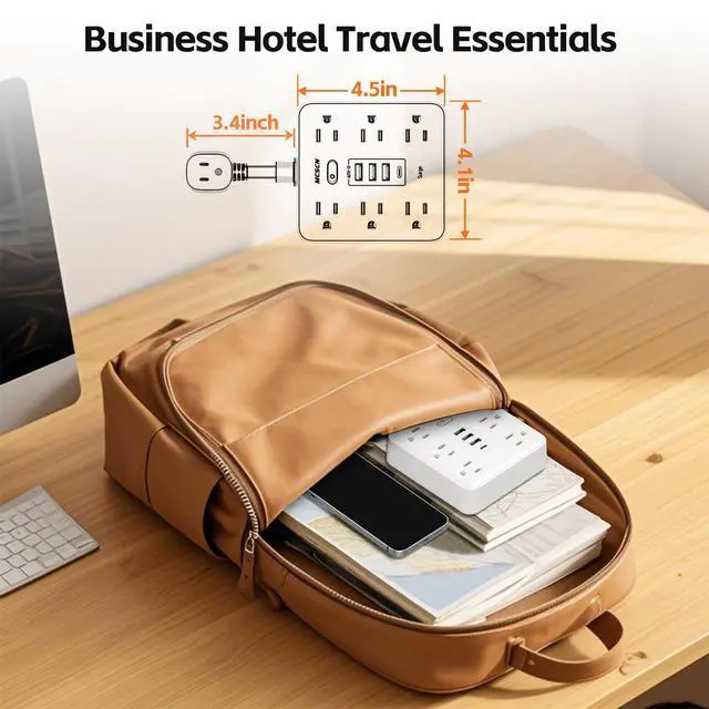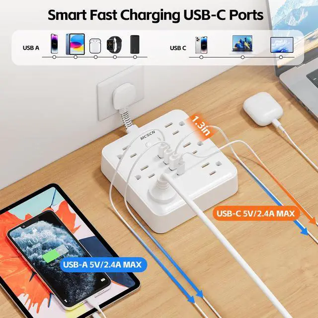 10in1 POWER Strips: This 3-pin power strip features 6 AC outlets and 4 USB ports (1 USB C charger), with IC Smart Recognition technology for faster charging speeds up to 2.4A (USB-C), and a total output of 5V/2.4A, allowing you to power up to 10 devices simultaneously. The socket interval is 1.3 inches, accommodating most plugs without blocking each other.