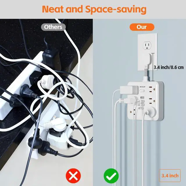 MULTIPLE SCENE USE: Equipped with 2 3-way mounting holes on the back, this power strip can be installed behind the TV or bed, or under a table or cupboard, effectively concealing cables and keeping your space tidy. It also features 4 non-slip pads for secure table use.