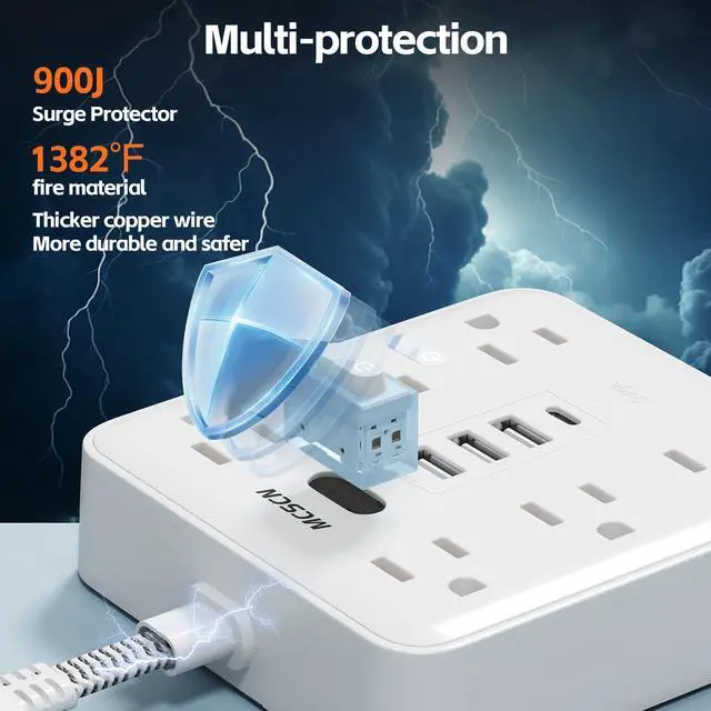 MULTIPLE PROTECTION: This surge protector offers surge protection to safeguard your electronic devices from surges and spikes, with a minimum energy absorption capacity of 900 joules. An overload switch will automatically trip if the power load exceeds 15A/1875W. The product has passed safety detection reports, and is made of flame retardant materials rated up to 1382 for added safety.