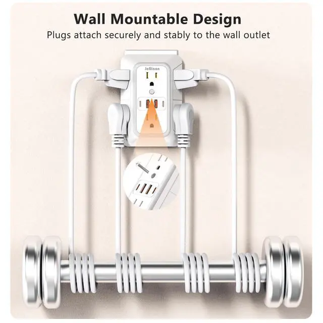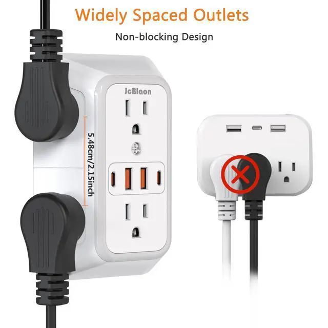Wide-Space Multi Outlet PlugDesigned with 2.15 inches of widely spaced outlets, the surge protector wall mount is great for all kinds of plugs without blocking each other, especially large plugs. The compact size takes up less space on your desk or luggage, making it a must-have accessory for travel, dorm rooms, homes, offices, bedrooms, kitchens, and more.