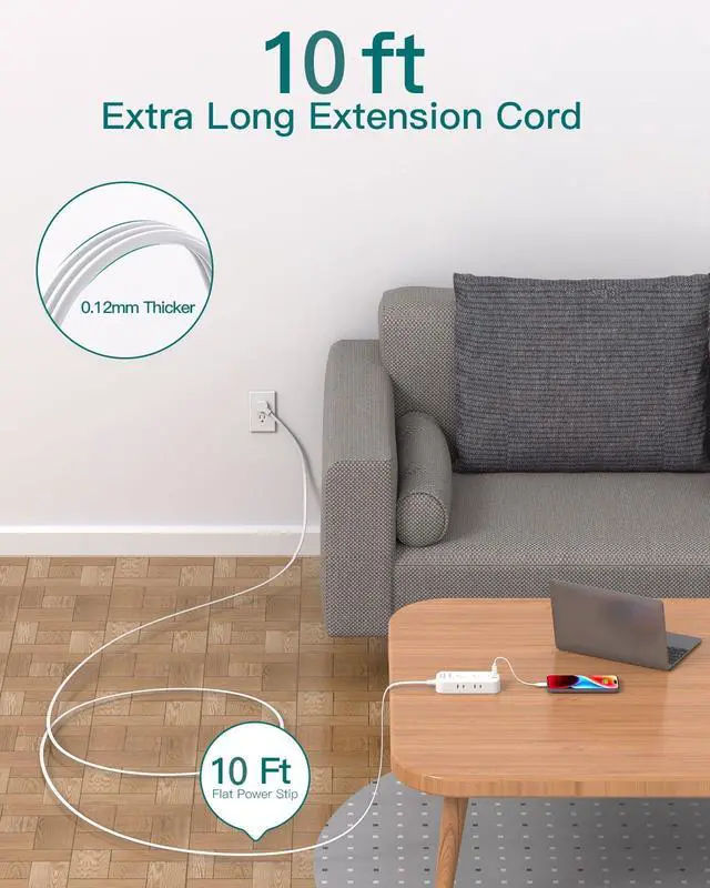 10 FT Long Extension Cord The extra long 10ft cord provides flexibility to reach distant outlets and hard-to-reach places. The 0.12in flat cord can easily run along the wall, floor, or under carpet without causing a bulge, protecting your family from tripping and making sweeping and mopping easier. The ultra-thin flat plug fits easily in tight spaces like behind furniture, bookshelves, and desks.