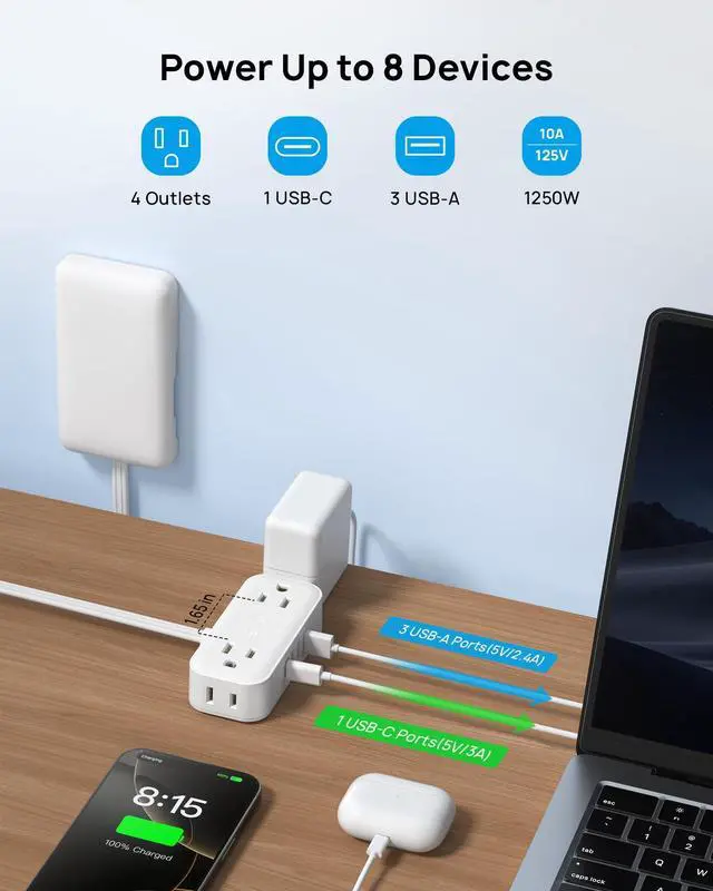 8-in-1 Desktop Power Strip: This outlet cover extension cord features 4 AC outlets, 3 USB-A ports, and 1 USB-C port to charge 8 devices simultaneously. It handles smartphones, tablets, laptops, cameras, e-readers, and more. The power strip supports a maximum power of 1250W (125V/10A) and works with voltages from 100V to 250V.