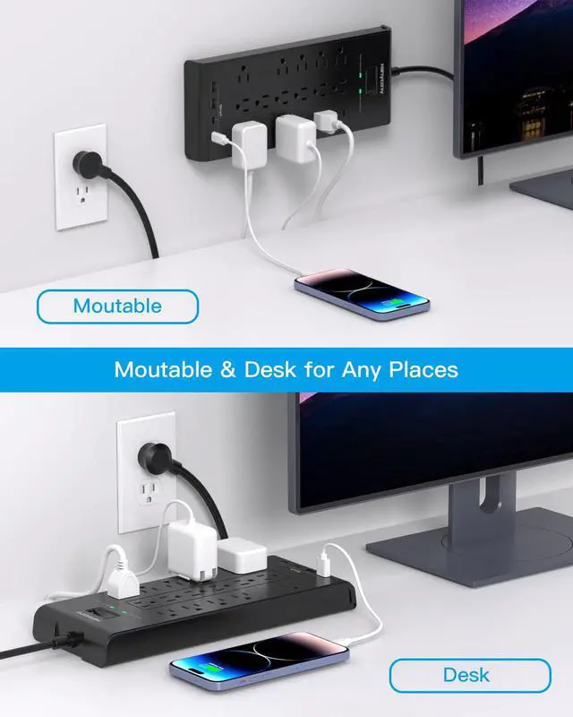 Surge Protector Power Strip with USB C Ports: 4 USB ports total 3.1 A, each USB A port features 2.4A Max output. USB C charging port features 3A MAX. Built with smart technology, detecting charging devices and delivering optimal charging speed automatically, compatible with most USB devices.