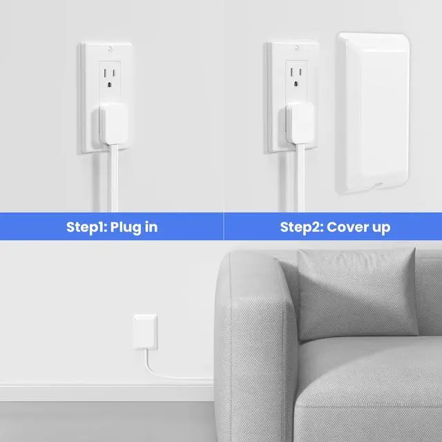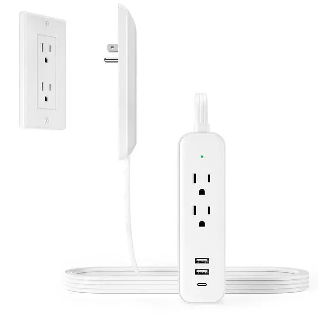 Flat Wire Extension Cord: The white extension cord with a flat plug serves as a surge protector and multi-port charger, ideal for tight spaces such as behind furniture, kitchen countertops, and gaming rooms. It's a must-have for any setup, providing convenience for multiple devices and travel needs.
