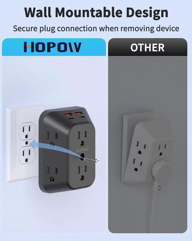 10 IN 1 USB Wall OutletThis surge protector fits any duplex outlet perfectly. Includes 6 AC outlets and 4 USB ports (2 USB-C). Features a center screw and back clips for secure attachmentwon't fall off. Charges up to 10 devices at once, ideal for all power needs. Please note: For some outlets, the black plastic prong can be cut off before using.