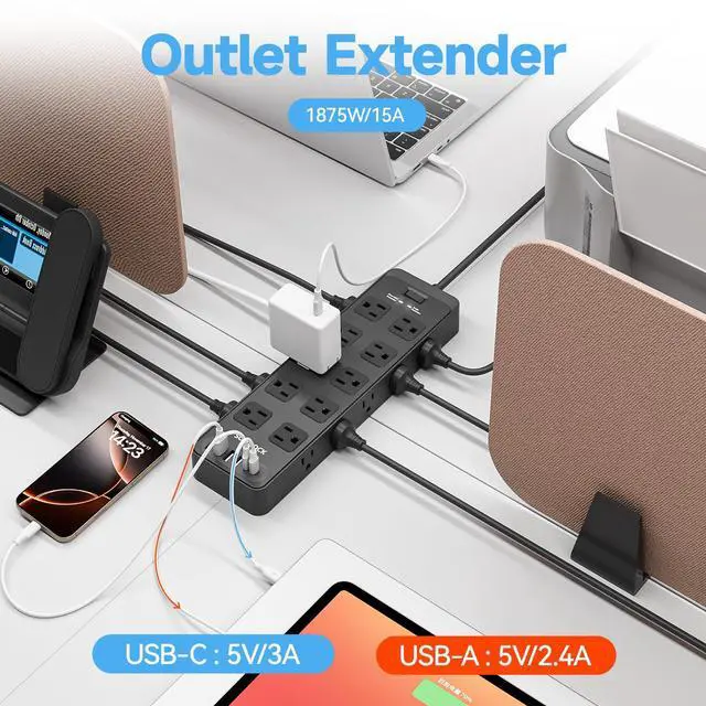Extension Cord with Multiple Outlets, Widely Used In Various Devices - This power strip is ideal for various electronic devices under 1875W/15A max, such as computers, TVs, mobile phones, smart home gadgets, and kitchen appliances. Always verify that your devices fall within this power range.