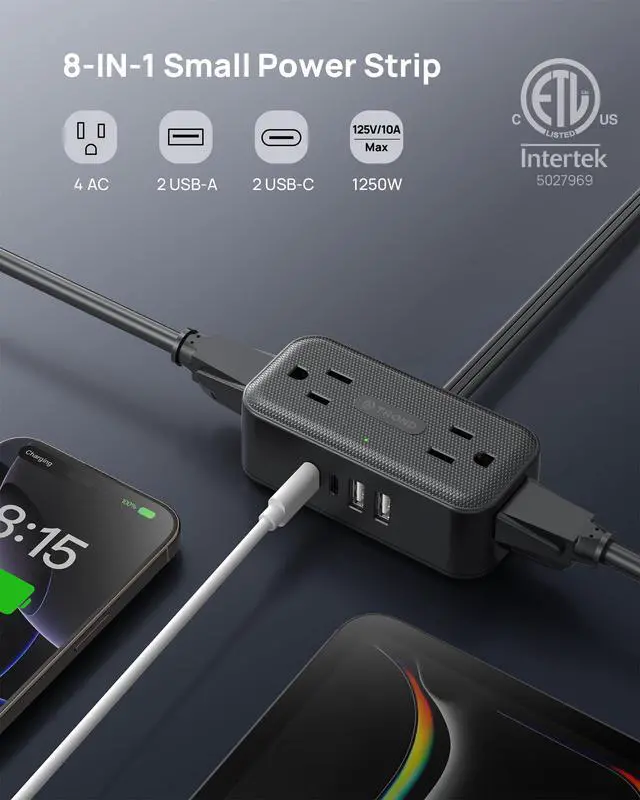 8-in-1 Charging Station: Strategically positioned ports allow simultaneous charging of 8 devices - from laptops to smartwatches - making it the ultimate solution for home offices and entertainment centers. Dual USB-C ports deliver 5V/3.0A fast charging for electronic devices, while USB-A ports provide 5V/2.4A optimized flow. Intelligent IC automatically adjusts output to prevent overcharging.