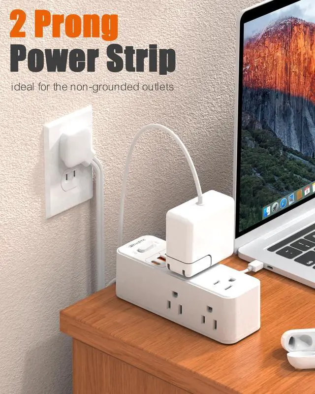 2 Prong Power Strip, 2 Prong to 3 Prong Outlet Adapter, 1400J Two Prong Surge Protector, 5ft Extension Cord, 6 AC Outlets with 2 USB C & 2 USB A Ports, Wall Mountable, Ideal for Old House