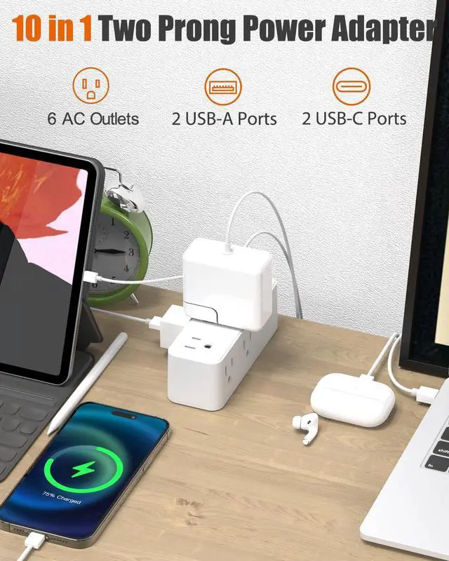 10-in-1 Design Charging Station: The two prong to three prong outlet adapter with 6 outlets + 4 USB ports can safely charge up to 10 devices from a single small wall charging unit. Max capacity up to 1250 Watt (Max 125 Volt, 10 A). The USB ports will automatically detect devices and deliver the optimal charging current. Maximum 2.4A output for 2 USB-A ports, maximum 3.0A output for 2 USB-C ports, with a total output of 3.4A/17W. Compatible with mobile phones, cameras, e-readers, and more.