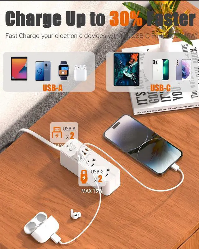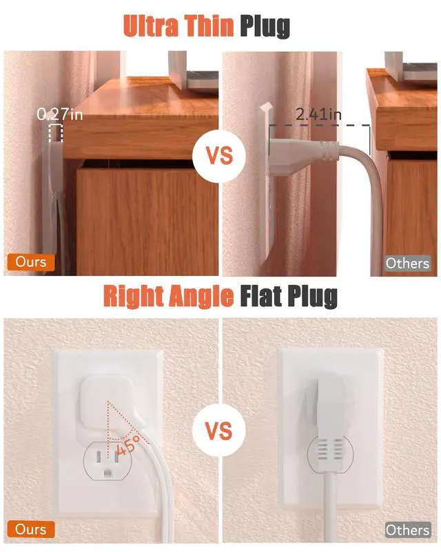 45° Angle Flat Plug Power Strip: With only a 0.27 inch flat plug design, the flat wall plug is much thinner than traditional plugs, allowing it to sit close to the wall easily and hide behind furniture, beds, or refrigerators, maximizing space efficiency. The 45° angle flat plug design keeps another outlet free.