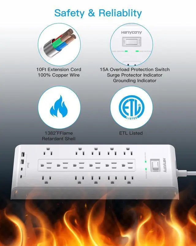 10 Ft Extension Cord Flat Plug & Wall Mount: Equipped with 4 screw-mounting holes on the back, this surge protector power strip can be securely installed in various applications. The 45° angled flat plug fits perfectly behind furniture like bookshelves, nightstands, or TVs without covering the bottom outlet. The 10 ft power strip efficiently extends power from a fixed wall outlet to longer distances.