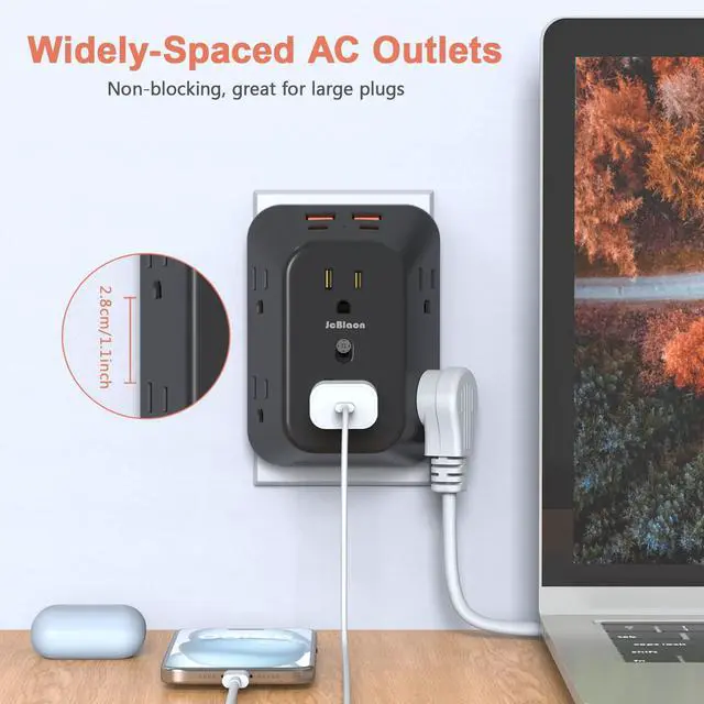 Wide spacing multi socket plugThis surge protector socket has a spacing of 1.1 inches, which is very suitable for inserting various plugs without blocking each other, especially for large plugs. The compact size can reduce the space occupied by desktops or suitcases, making it an essential accessory for travel, dormitories, offices, bedrooms, kitchens, and other occasions.