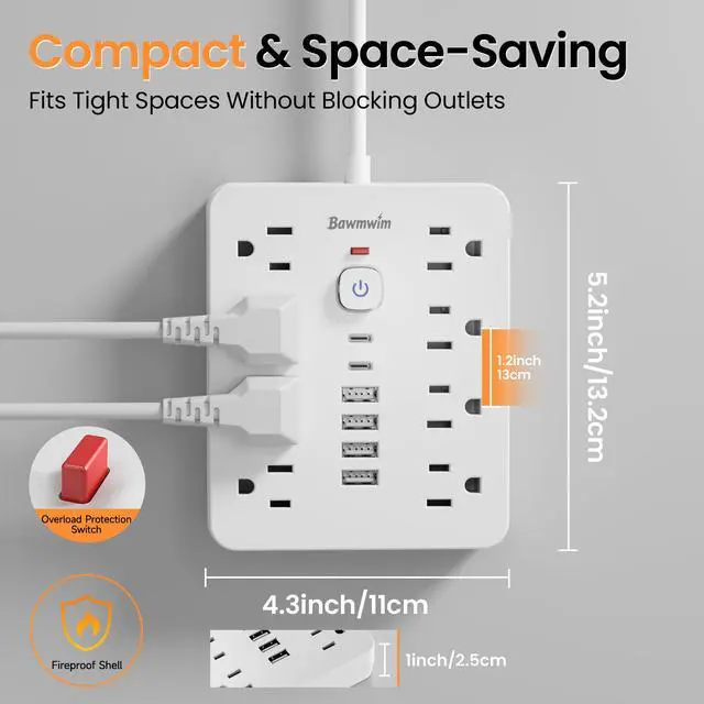 14 in 1 Surge Protector Power StripThis 14 in 1 power surge protector strip features 8 outlets (1.2 inch space/1250W/10A), 4 USB A & 2 USB C charging ports (5V/2.4A each), serving as both a multi plug outlet surge protector and extension cord with USB ports. The 1.2 inch strategic space-saving outlets accommodate more than 90% bulky adapters with ease.
