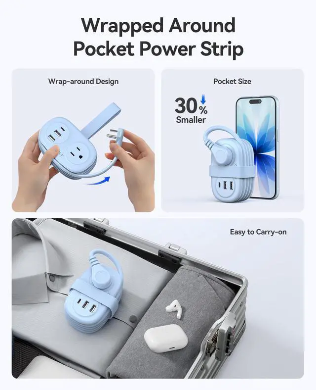 Pocket Travel Power Strip: This power strip is smaller than a mobile phone and features a wrap-around design that can fit into any package suitcase, taking up minimal space. Here are your best travel essentials! (The voltage of the portable extension cord is 125V. If your device does not support 125V, you will need a transformer and adapter to use this strip.) The size of the power strip is 5.24 x 2.95 x 2.72 inches and the weight is 8.11 ounces.