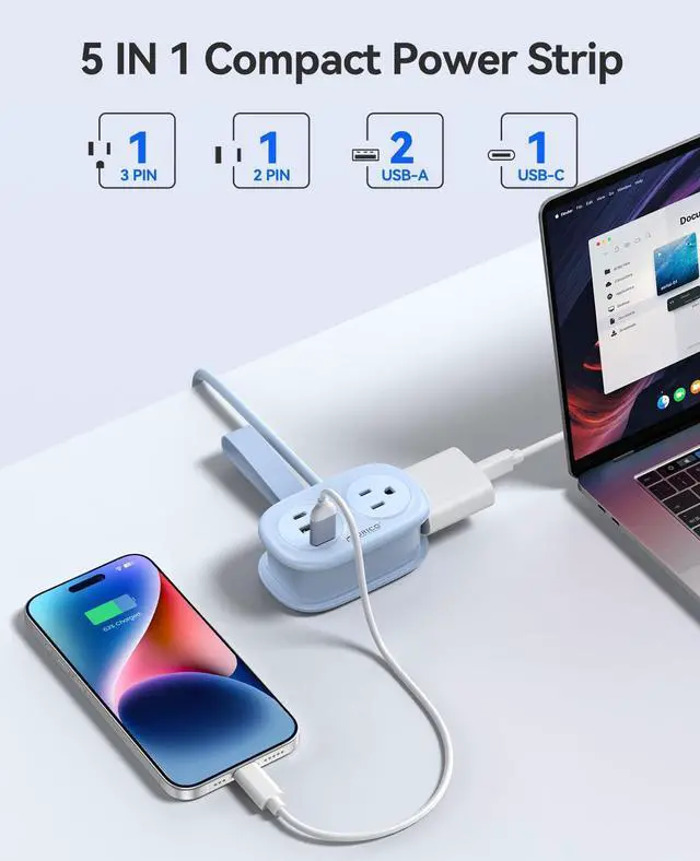 5-in-1 Travel Power Strip with USB C Port: This travel power strip includes 2 AC power outlets, 2 USB-A ports, and 1 USB-C port. The extension cord with multiple outlets can support 5 electronic devices simultaneously, such as cell phones, iPads, laptops, desk lamps, cameras, and many more.