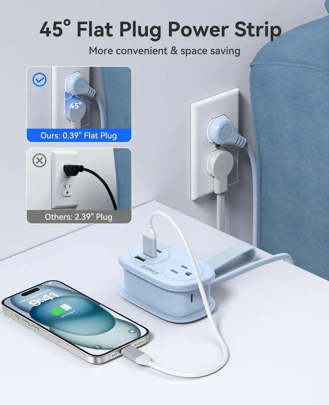 45° Flat Plug Power Strip: Many hotel sockets are installed behind the bed, requiring the bed to be moved to access them. The travel extension cord with USB ports adopts a flat plug design, allowing it to be used behind a narrow bed or sofa. The 45-degree angle design will not block the bottom socket of a double wall socket and can free up space for other uses.