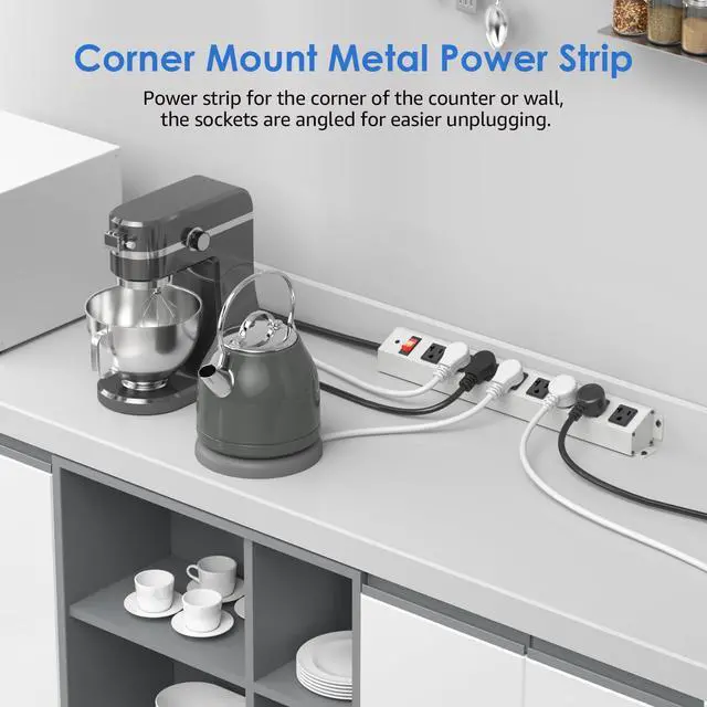 Corner Mount Angle Power Strip, Under Cabinet Heavy Duty 8 Outlets Power Strip 20Amp, Metal Underneath Desk Plug Surge Protector, Wall Mountable, for Garage, Shop, Kitchen. 3FT Extension Cord.