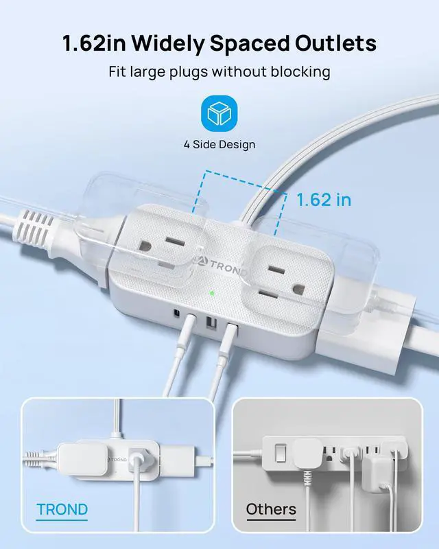 8-in-1 Power Strip with USB Ports: This extension cord comes with 4 AC Outlets (1250W Max), 2 USB-C, and 2 USB-A, accommodating standard 2 prong or 3 prong plugs. Widely spaced outlets allow for large plugs without blocking them. Suitable for various settings including dorm rooms, homes, offices, and outdoor events.