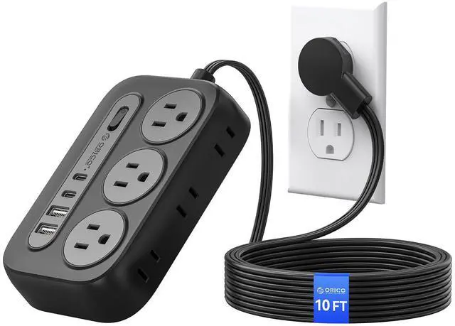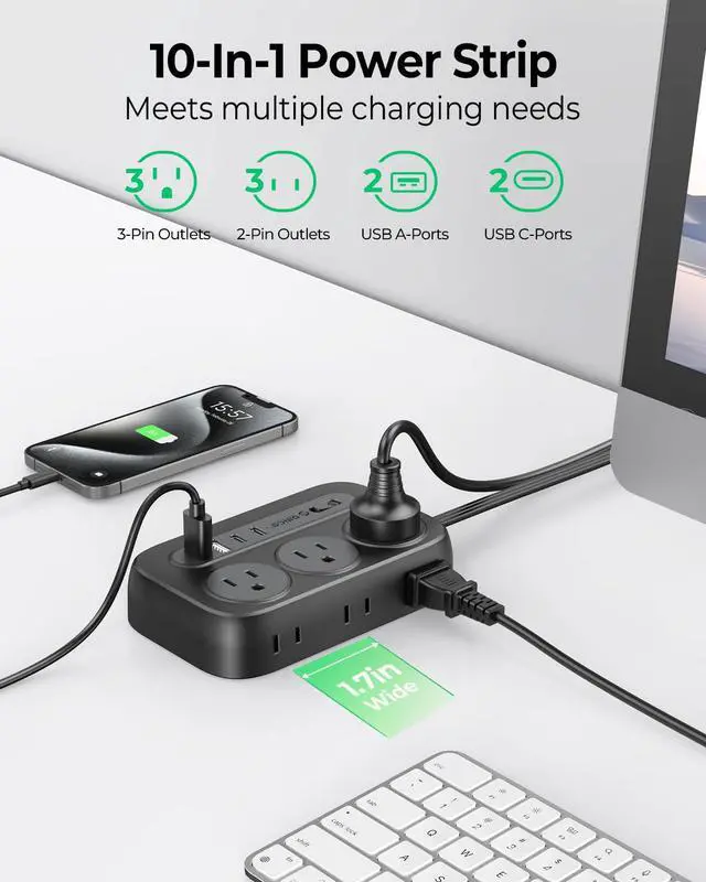 10-IN-1 Desktop USB Power Strip: Multiple outlets extension cord offers 6 AC outlets (1250W/125V/10A), spaced 1.7 inches apart for large plugs without interference. Dual-side design includes 2 USB-A and 2 USB-C ports. Accommodates multiple devices, creating an organized charging station.