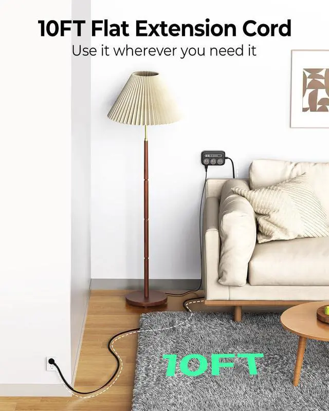 10 FT Flat Extension Cord: Long and flexible cord reaches any spot, fitting through narrow spaces. Enables easy furniture rearrangement. Ultra-thin 3mm cable hides easily, reducing clutter and tripping risks. Keeps rooms tidy and safe for children and pets.
