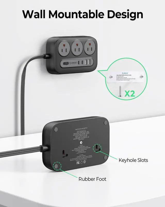 Mountable Wall Extension Cord: Featuring 2 wall mount holes for easy space management, this flat power strip offers versatile installation options on workbenches, walls, under counters, etc.; 4 rubber feet keep it securely in place, preventing slips and slides.