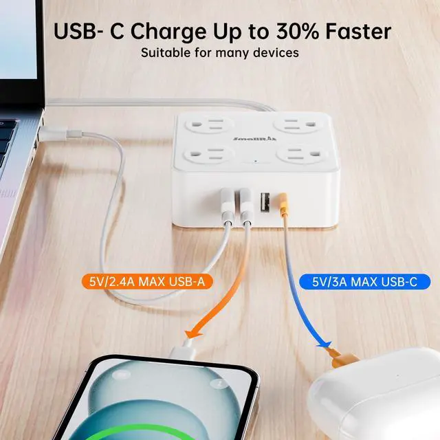 Fast USB C & USB A Charging Ports: Get fast charging with 1 USB C (5V 3A) and 3 USB A ports (5V 2.4A). This power strip quickly powers phones, tablets, and other devices. It's the perfect USB hub and power expander for your desktop or bedside, keeping all your gadgets charged in one safe, convenient spot.