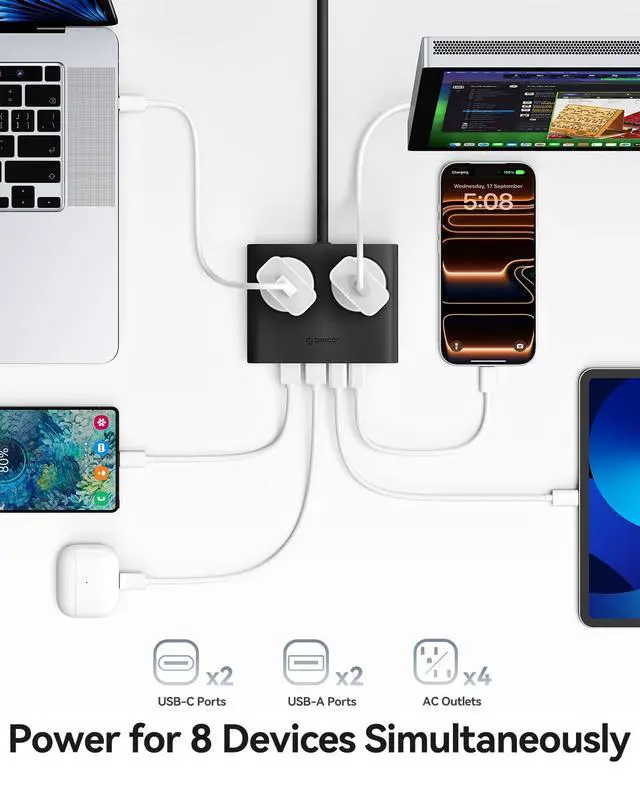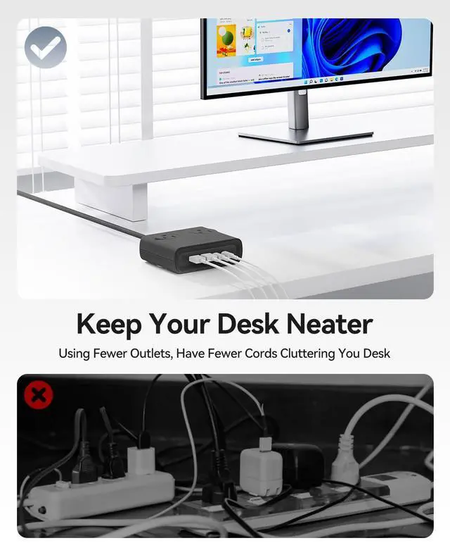 Compact Size & Aesthetic Colors: This USB-C power strip measures just 7.44 x 5.51 x 2.4 inches, and its compact design helps keep your desktop tidy and well-organized. Available in black, white, blue, and purple, redefine desktop aesthetics.
