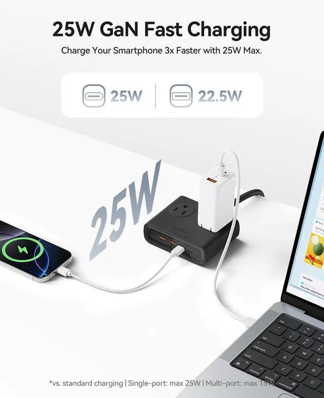 GaN Fast & Smart USB Charging: The USB-C ports can charge up to 25W, while the USB-A ports can charge up to 22.5W. 3 times faster than a normal charger. Whether it is a phone, tablet or other USB devices, it can be charged directly through the USB interface on the power strip, saving your time and space.
