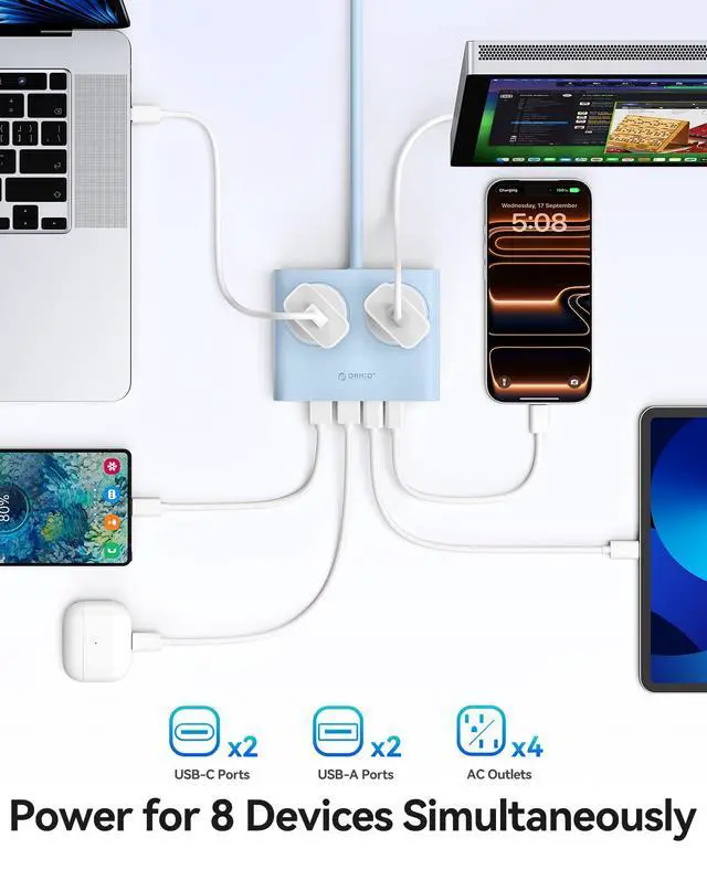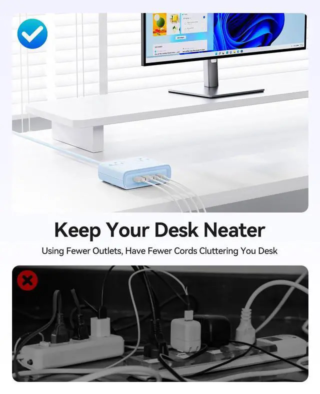 Compact Size & Aesthetic Colors This USB-C power strip measures just 7.13 x 5.51 x 2.48 inches. Its compact design helps keep your desktop tidy and well-organized. Available in black, white, blue, and purple.