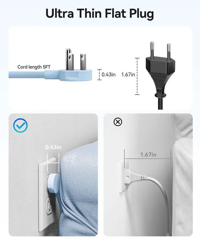45° Flat Plug Power Strip With a 0.43-inch thin flat plug and 45° right-angle design, the outlet extender can be easily installed in narrow places, such as behind furniture, sofa, bed, TV cabinet, or bedside table. It also doesn't block the bottom socket of a double wall outlet, maximizing socket usage.