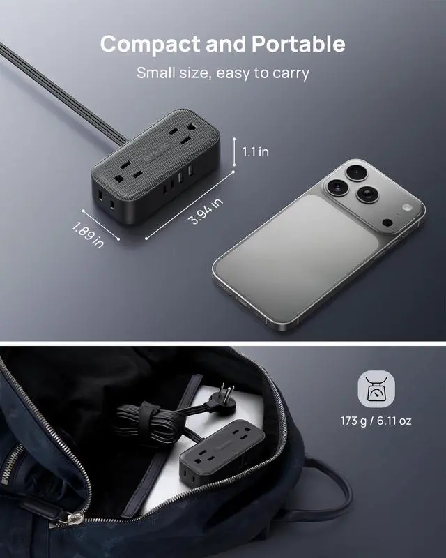 Compact Size: Measured only 3.94 x 1.89 x 0.1 inches, this small power strip with USB ports is easy to pack in a briefcase, suitcase, or backpack when you're on the go. It is portable and lightweight, making it ideal for travel, business trips, hotels, and outdoor gatherings.