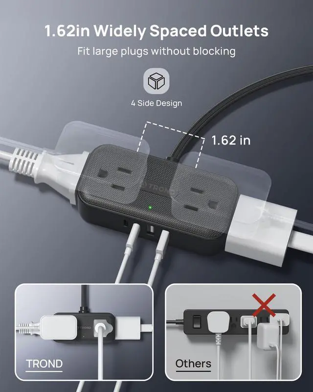 8-in-1 Power Strip with USB Ports: This extension cord features 4 AC Outlets (1250W Max), 2 USB-C, and 2 USB-A, accommodating standard 2 prong or 3 prong plugs. Widely spaced outlets allow for large plugs without blocking adjacent sockets. Perfect for college dorm rooms, homes, bedrooms, living rooms, offices, travel, electric decorations, and more.