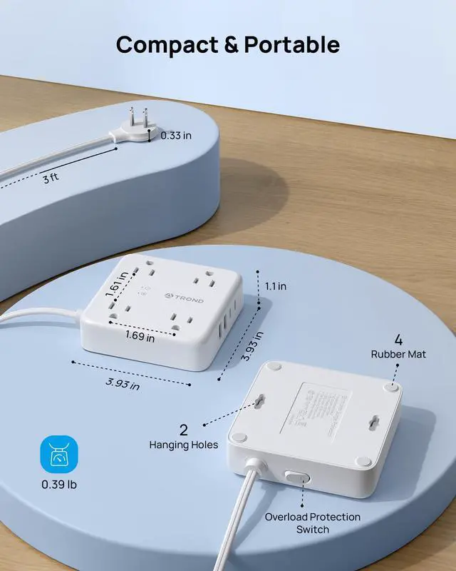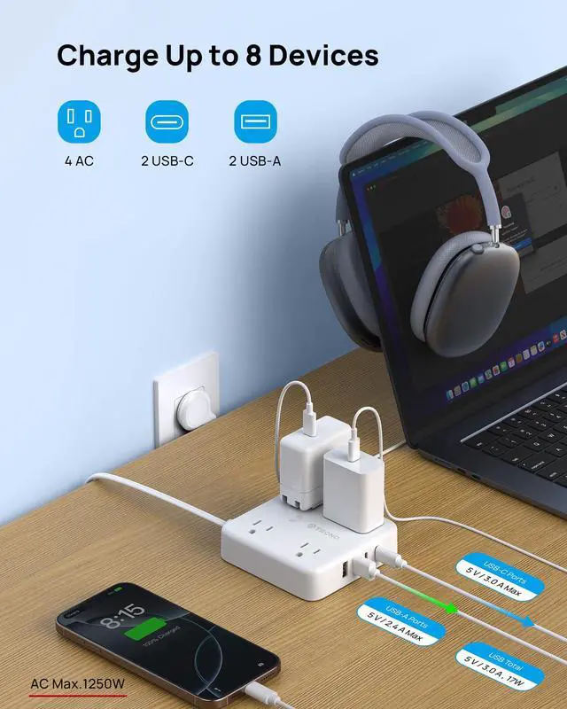 8-in-1 Charging Station: This compact 2 prong power strip with 4 AC outlets (max 1250W/10A), 2 USB-C ports, and 2 USB-A ports can safely power up to 8 devices without unplugging each other. Compatible with smartphones, tablets, laptops, cameras, e-readers, and more. The design of this outlet is widely spaced, allowing you to use all four outlets. Perfect for large plugs.
