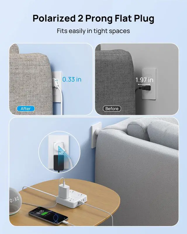 2 Prong Flat Plug Power Strip: The two prong to three prong power strip has a thin polarized flat plug (only 0.33 inches thick) that helps keep furniture close to the wall and hides the plug discreetly behind furniture. The design with a 45° right angle flat plug won't affect the bottom outlet after inserting it into the top socket of your wall outlet.